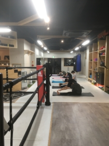 90分のシステム化された休憩を挟んだ待ち時間なしの効率的なトレーニング(ストレッチ、サンドバッグ、ミット、フィジカルトレーニング)